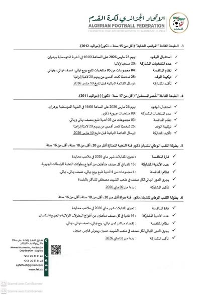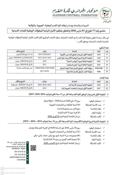 المنشور رقم 71 الصادر عن الاتحاد الجزائري لكرة القدم والمتعلق بتنظيم الأدوار النهائية للبطولات الوطنية الخاصة بجميع الفئات الشبانية، للموسم الرياضي 2025 / 2026. حيث يحدد هذا المنشور كيفيات التأهل، نظام المنافسة، رزنامة الأدوار النهائية، إضافة إلى الشروط التنظيمية والإدارية الخاصة بإجراء مباريات التتويج وذلك في إطار ضمان حسن التنظيم، تكافؤ الفرص و إحترام القوانين المعمول بها.: